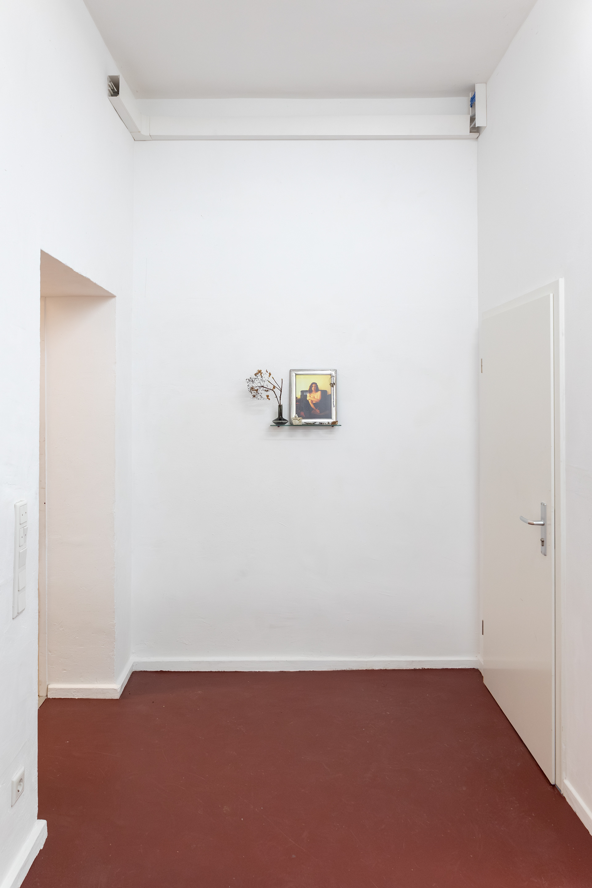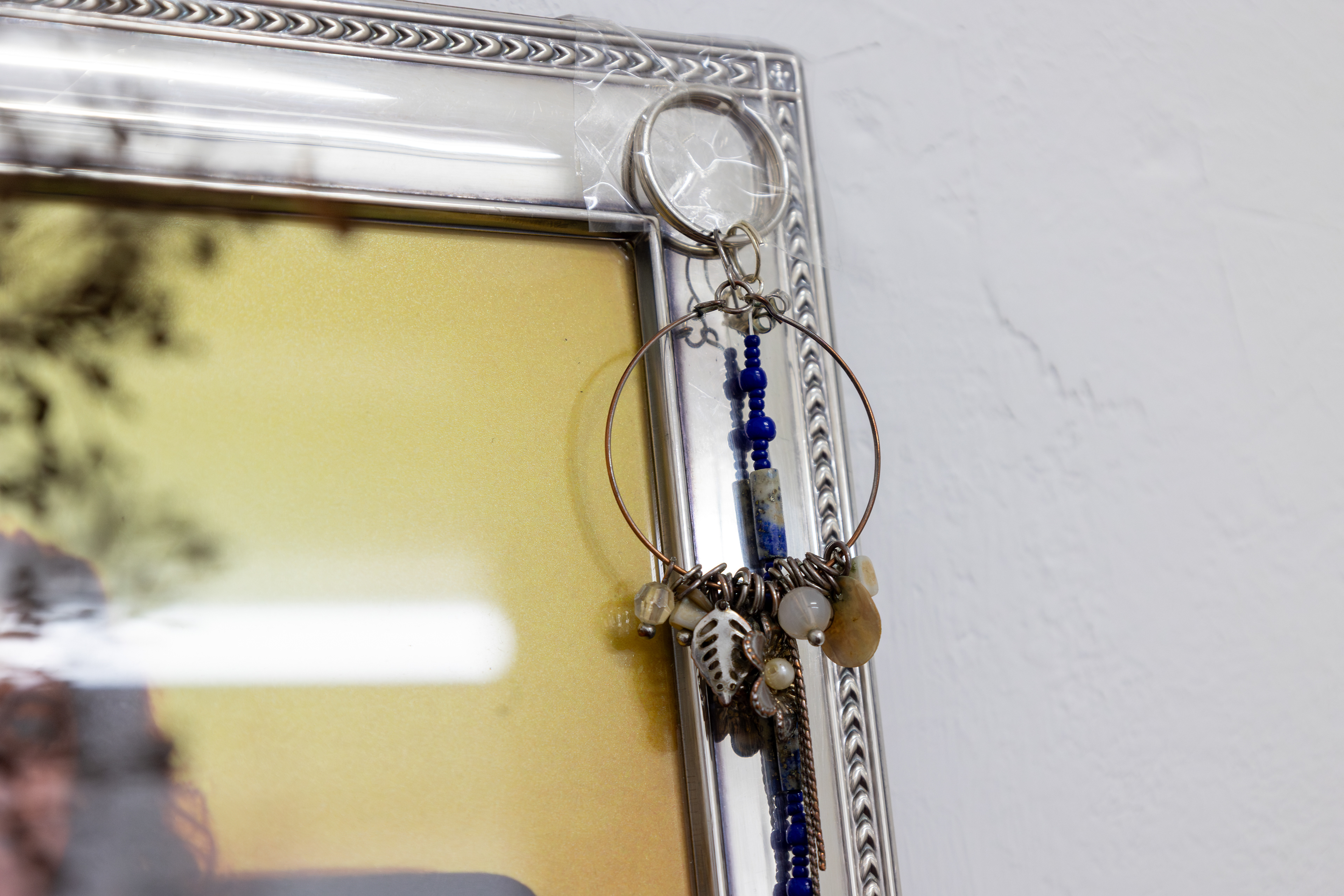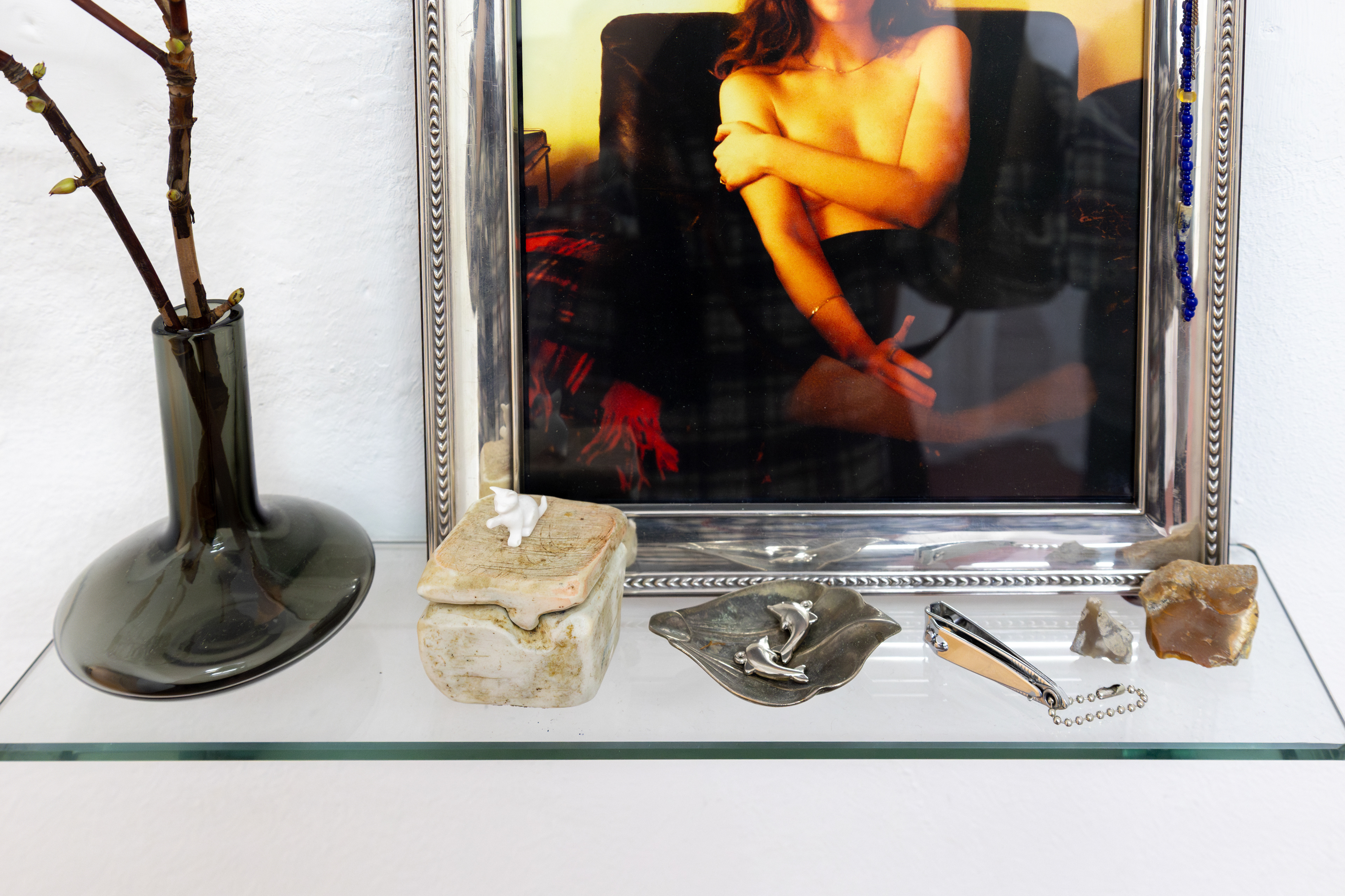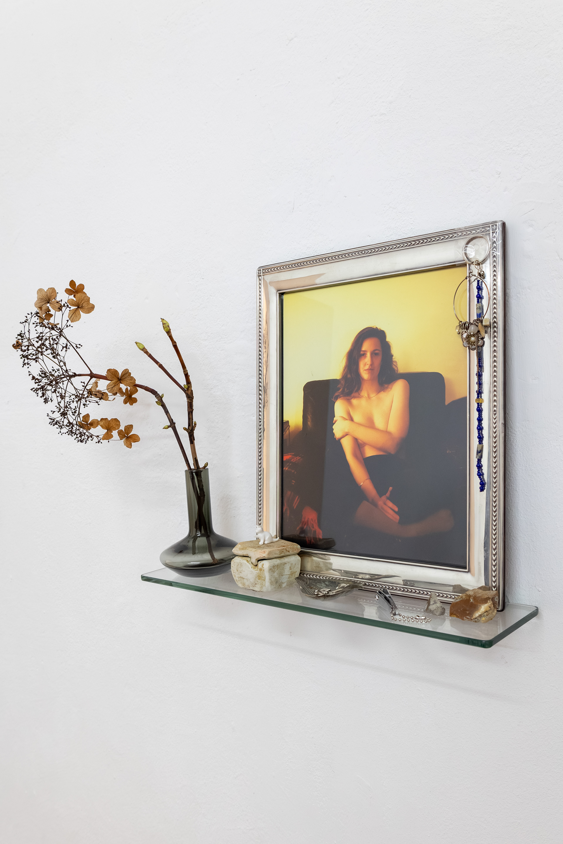 Analogue Photography in Digital Inkjet Print, various found Objects, Blue Pigment, Dried Plant, Glas and Stone Beads, Silver Frame, Glass Platter. Photos by Arash Goudarzy-Malayeri